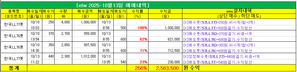 투자원금 3개(300만원)로 단타 대응해 256만원 수익을 실현했습니다.